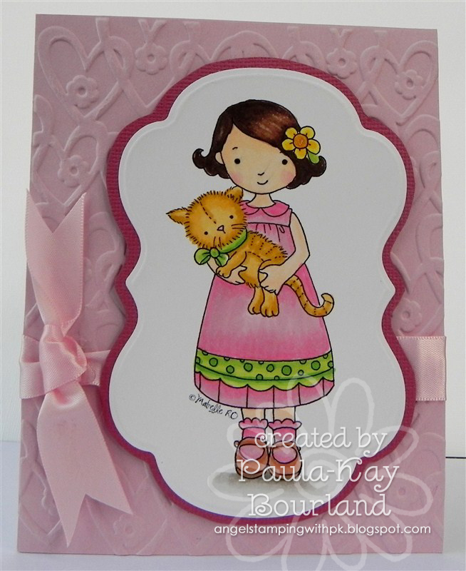 The third card is another digi image from Mabelle called Girl with Kitty. I used a Cuttlebug heart impressabilities folder for the background cardstock to make this Valentine. It also is colored with Copic Markers and has a pink bow for an embellishment.